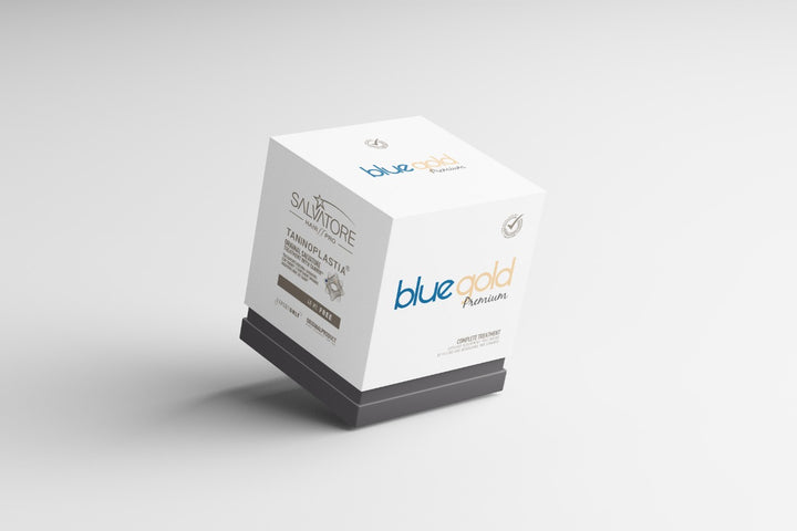 SALVATORE BLUE GOLD PREMIUM est l'évolution du lissage progressif. Sa formule exclusive est basé sur un concentré d'extraits de tanin.